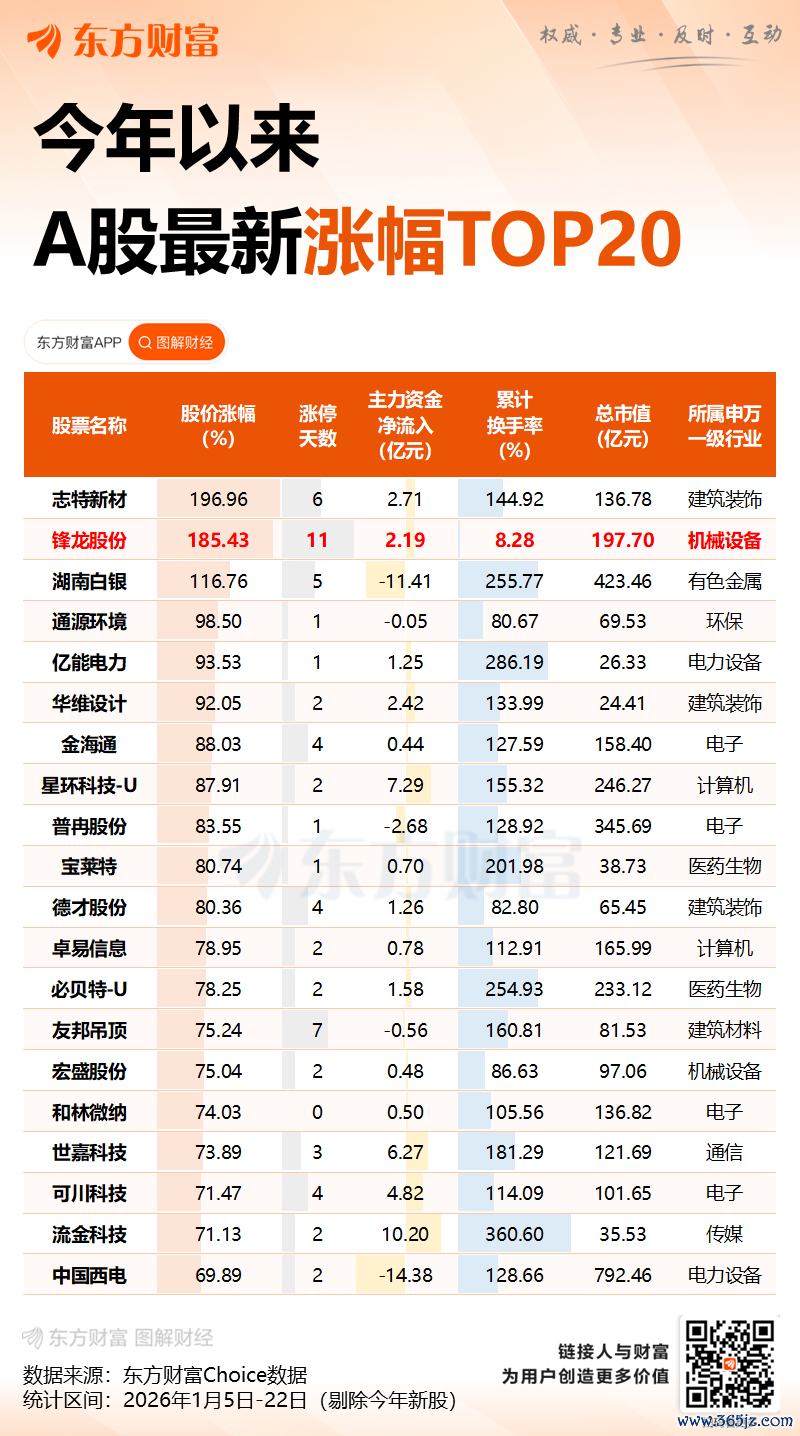 自2025年12月启动行情以来,锋龙股份(002931.SZ)在短短20余天内上演了一场教科书级的资本狂欢。截至2026年1月22日,公司股价已连续收获17个涨停板,股价从17元区间一路狂飙至90元以上,市值逼近200亿元。