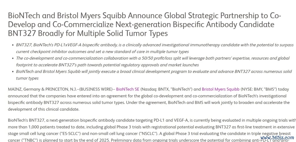 当地时间6月2日,百时美施贵宝(BMS)和百欧恩泰(BioNTech)宣布双方已达成协议,将在全球范围内共同开发和商业化百欧恩泰的双特异性抗体候选药物BNT327。BNT327是一种针对PD-L1和VEGF-A的双抗药物,有潜力用于多种实体瘤的治疗。根据协议,BMS将向百欧恩泰支付15亿美元的首付款,并在2028年前支付总计20亿美元的非或有性周年付款(non-contingent anniversary payments)。这些可抵扣税款的费用将在发生时被记录为已收购的IPR&D(科学研究与试验发展)费用,其中15亿美元将在第二季度入账。此外,百欧恩泰将有资格获得高达76亿美元的额外开发、监管和商业里程碑付款。按此计算,这次交易的总金额超过90亿美元。
